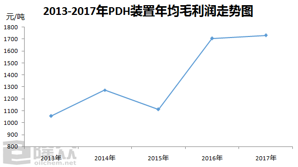 由上圖可見,2016-2017年丙烷脫氫毛利潤表現樂觀,裝置均無虧損情況,尤其在夏季,受原料氣丙烷價格低位,使丙烷脫氫裝置獲利更為理想。華南地區是國內進口氣集中地,而丙烷脫氫裝置,工藝來源于國外,原料氣丙烷也基本依賴進口,裝置在華南投產建設,原料提供方便。目前,華南地區的進口丙烷資源多作為工業氣或者搭配丁烷或者搭配當地煉廠氣今日民用市場,均是作為提供熱值的燃料,據隆眾數據監控,2016年華南進口毛利潤在257/噸左右,2017年至今進口毛利潤在194/噸左右,相比丙烷脫氫裝置利潤優勢十分明顯。