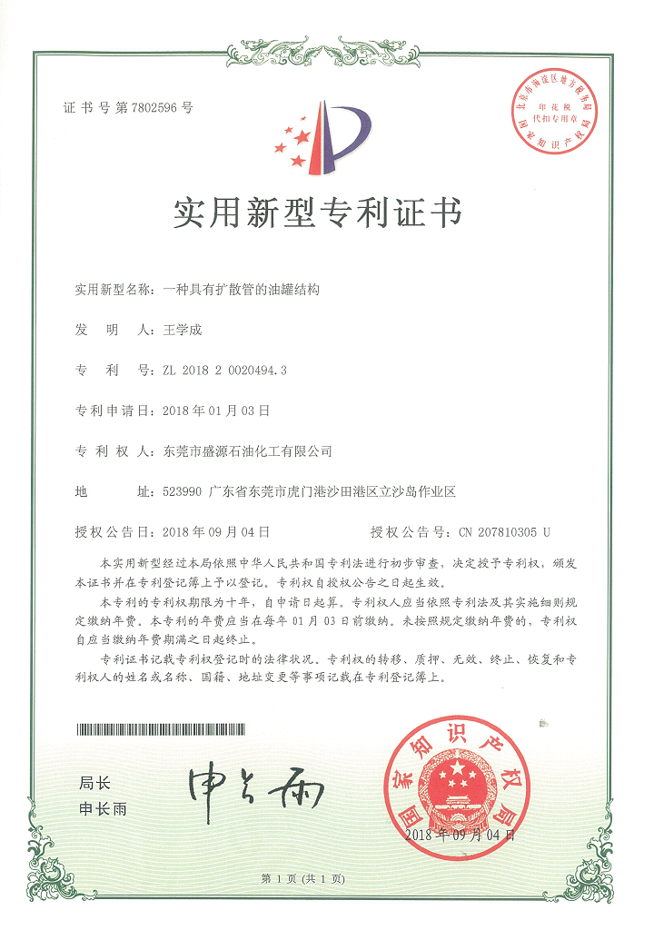 實用新型油罐結構專利證書Click for larger image