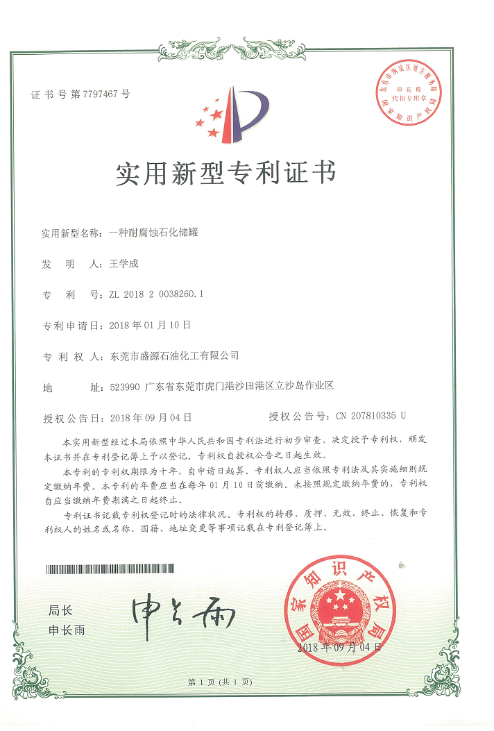 實(shí)用新型耐腐蝕儲(chǔ)罐專利證書Click for larger image