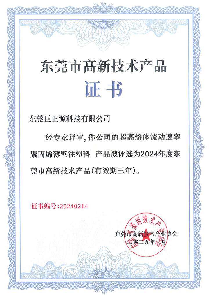 日前,東莞市高新技術產業協會公布了2024年東莞市高新技術產品名單。東莞巨正源科技有限公司自主研發、生產的超高熔體流動速率聚丙烯薄壁注塑料產品成功入選,被評選為2024年度東莞市高新技術產品,有效期三年。
