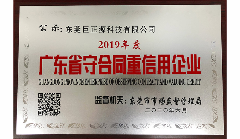 近日,經(jīng)東莞市市場監(jiān)督管理局審核批準,東莞巨正源科技有限公司獲得2019年度“廣東省守合同重信用企業(yè)”榮譽稱號。