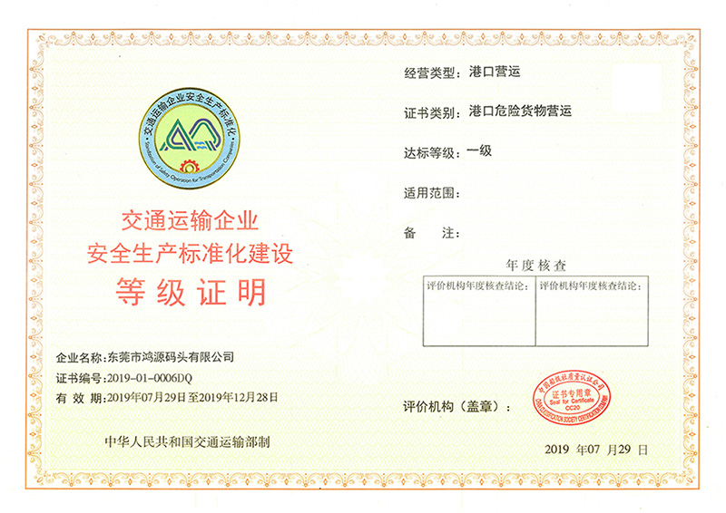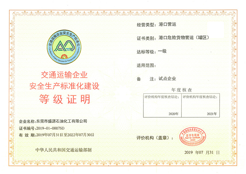 日前,巨正源所屬盛源石化、鴻源碼頭正式獲得由國家交通運輸部頒發的“交通運輸企業安全生產標準化建設一級達標企業證書”,這標志著盛源石化、鴻源碼頭安全生產管理邁上標準化、規范化的新臺階。