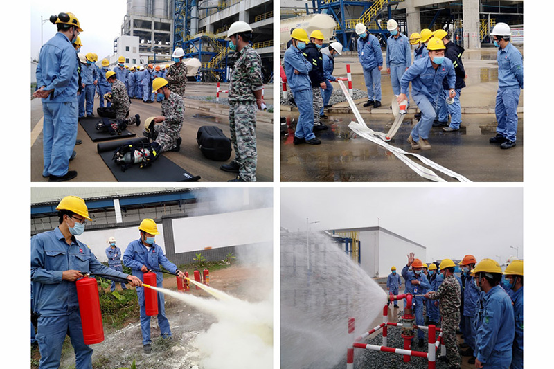 此次培訓安全理論知識與現場實際操作相結合,包括公司消防設施配備與分布、干粉滅火器的使用和日常檢查方法、消防水帶的使用方法、消防炮的使用方法以及空氣呼吸器的佩戴方式等內容。